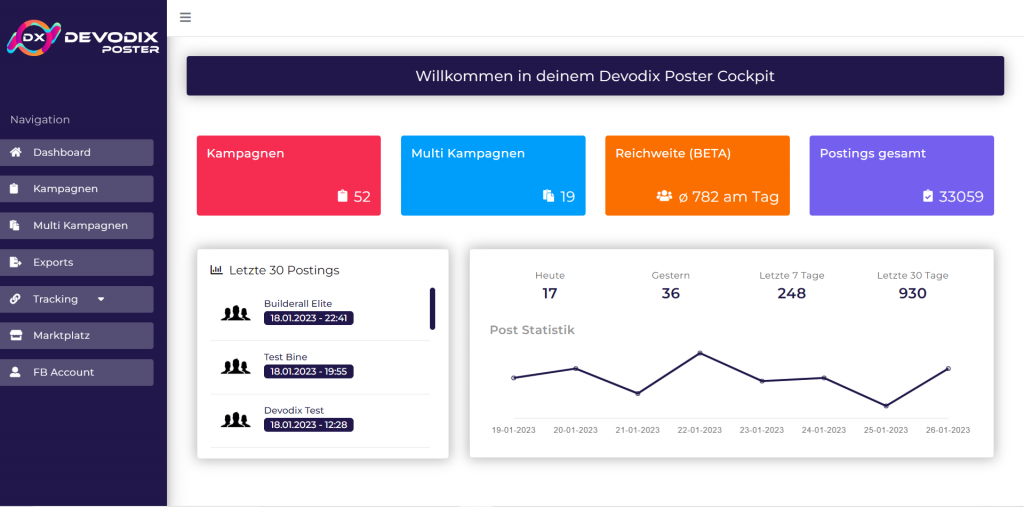 Mit dem devodix Poster bringst du dein Facebook Marketing auf Autopilot. Plane, poste und analysiere deine Inhalte vollautomatisch – für mehr Reichweite, mehr Zeit und messbar besseren Content.