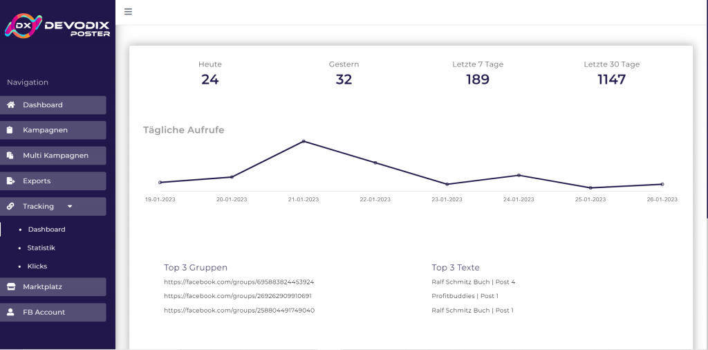 Mit dem Devodix Tracking siehst du ganz genau, welche Kampagnen dir Umsatz bringen. Das Tracking zeigt dir aus welchen Gruppen zu welchen Texten Klicks auf deine Links kommen.