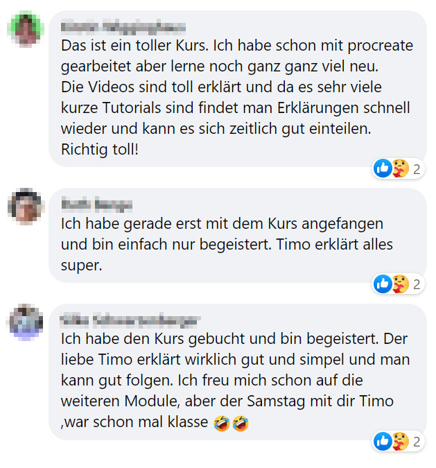 Ich bin begeistert von diesem Kurs. Obwohl ich schon einiges über Procreate wusste, hat Timo mir noch einiges mehr beigebracht. Der Kursist einfach strukturiert und wunderbar erklärt, dass es einfach Spass gemacht hat. Top für jeden Anfänger aber auch eine absolute Herzensempfehlung für Fortgeschrittene. Timo weiss wovon er spricht, man merkt, wieviel er über Procreate weiss. Und seine Art es weiterzuvermitteln ist grandios.