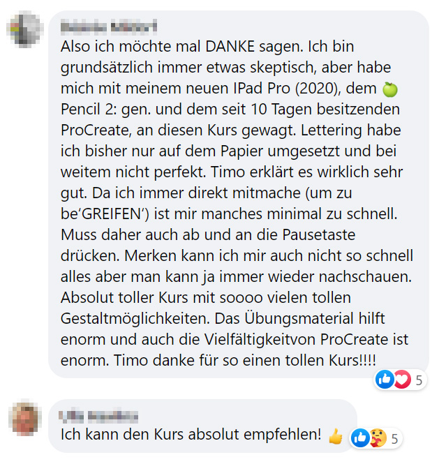 Überragend 😀 Ich bin total begeistert... Ich letter jetzt schon ne Zeit lang analog und hab mir das jetzt alles auch zugelegt... der Wahnsinn... Erstmal bin ich völlig sprachlos, was Procreate angeht, aber der Kurs toppt nochmal alles... Danke, dass es Dich gibt 😀 Es macht mega viel Spaß diese ganzen neuen Sachen zu lernen, ein Programm kennen zu lernen, das Gelernte umzusetzen und und und... Danke! Bin gespannt, was mich noch erwartet!🙂