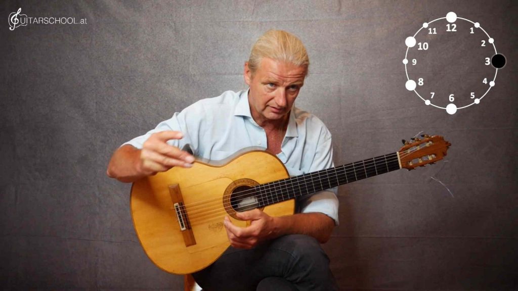 Daumentechniken (Pulgar) und Compás – Die Flamenco-Rhythmik ist eines der Elemente, die am Flamenco am meisten faszinieren! Typisch ist der „Zwölferrhythmus“, dessen Grundrhythmus (Compás) aus zwölf Taktschlägen mit festgelegter Betonung besteht. Um solche Rhythmen sehr einfach zu verdeutlichen, bietet sich an, diese mithilfe einer Uhr (Reloj del Flamenco – Flamencouhr) darzustellen.