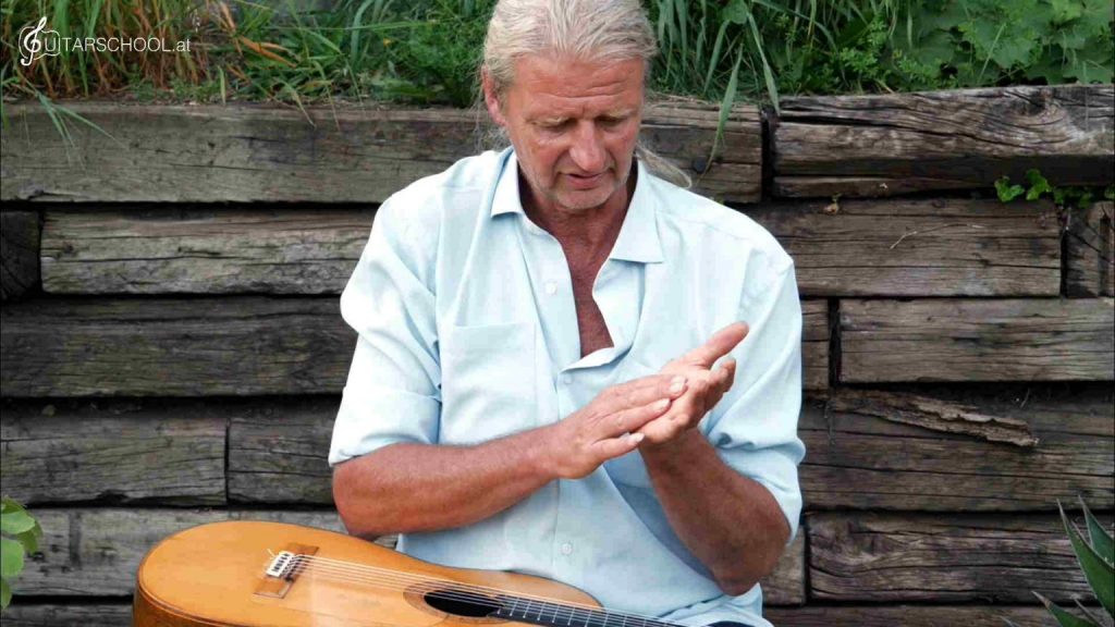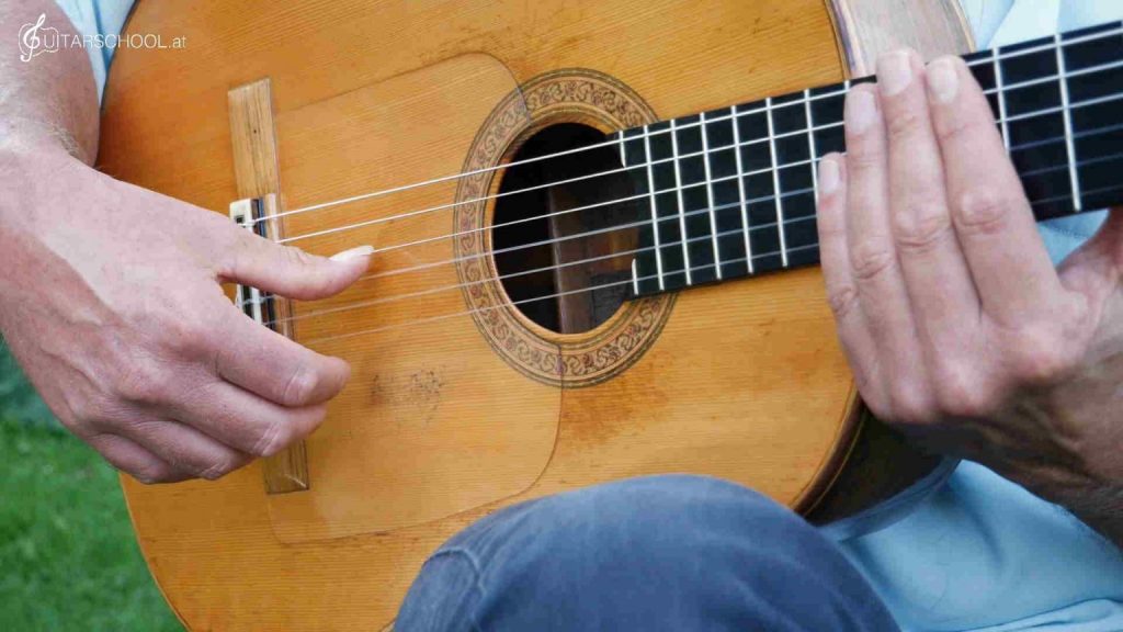 Golpe (Klopfen) – Hierbei wird zum Zweck der Betonung und Akzentuierung bzw. der rhythmischen Unterstützung während des Spielens auf die Gitarrendecke geklopft. Das passiert meistens mit dem Nagel des Ringfingers unterhalb der Saiten. Achtung: nicht auf eure teuren Klassischen Gitarren ohne Schlagschutz klopfen! Das führt zu Macken im Holz. Eine alternative zum Schlagschutz (Golpeador), die Abhilfe schafft, wird im Video erklärt …