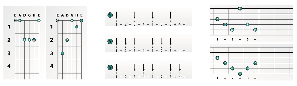 Danach lernen wir Schlag- und Zupfrhytmen die für dich wichtig sein werden. Ich gebe dir Tipps und Trick wie du gemütlich und effizient von Griff zu Griff wechselst um Krämpfe in den Fingern und Handgelenken zu vermeiden.