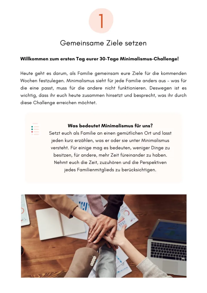 Das E-Book „Die 30 Tage Challenge – Minimalismus in der Familie“ ist dein praktischer Begleiter, der dich und deine Familie durch eine transformative Reise führt. Jeden Tag erhältst du eine leicht umsetzbare Aufgabe, die euch Schritt für Schritt zu einem aufgeräumten, übersichtlicheren und glücklicheren Alltag bringt.