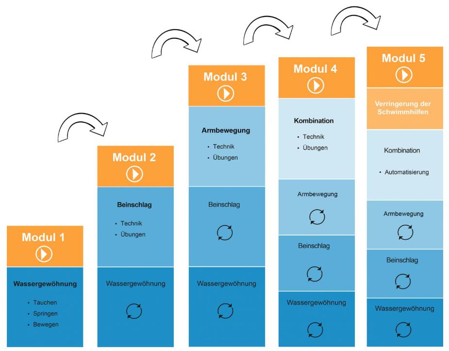 - Pro Modul gibt es umfangreiche Lernvideos direkt aus dem Schwimmbad inklusive detaillierter Erklärungen und Zusatzinfos für Eltern und Kind.