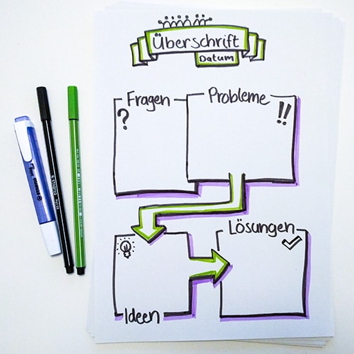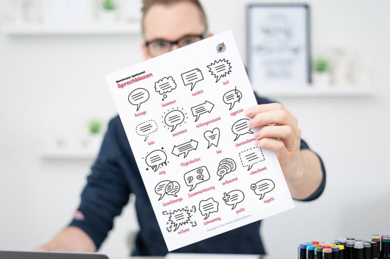So hast du sofort ein gewisses Repertoire an Sketchnotes Elementen, auf das du zurückgreifen kannst. Mit einem weiteren Vorteil: Du kannst sie dir ausdrucken und neben deinen Notizblock legen.