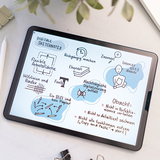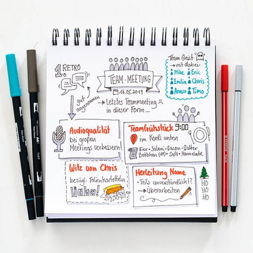 Doch anders herum funktioniert es prima: Das Sketchnoting ist der ideale Grundstein für die Arbeit mit dem Stift. Damit ist es auch geeignet um deine Fähigkeiten später zum Zeichnen und Illustrieren weiterzuentwickeln.
