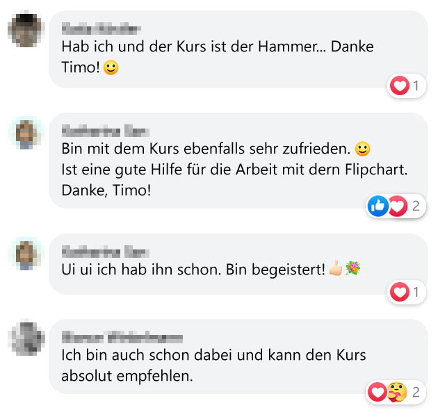 Der Kurs ist großartig - übersichtlich aufgebaut, in die richtige Art von Häppchen unterteilt (Videos nicht zu lang und immer schön auf den Punkt), Timo hat eine wirklich sehr sehr angenehme Art zu vermitteln und man hört und sieht gern zu. Das Material und die Erläuterungen sind wirklich extrem hilfreich und gut strukturiert und ich fühlte mich durchweg gut angeleitet und hatte immer das Gefühl, dass Timo von Herzen gern seine Tipps und Tricks teilt.