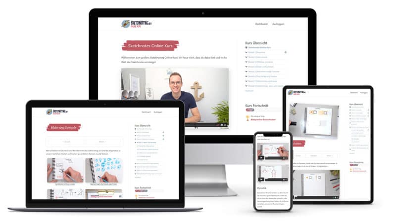 Dein Kurszugang ermöglicht dir effektives Lernen – an jedem Ort, zu jeder Zeit, auf jedem Gerät. So wie es dir gerade gefällt! Die selbst entwickelte Plattform unterstützt und motiviert dich, das Sketchnoting Schritt für Schritt zu lernen.