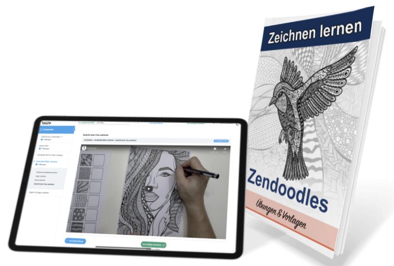 Mit dem Kurs bekommst auch du den Zugriff zu den Video-Tutorials. Diese beinhalten Schritt für Schritt Anleitungen für jede Übung. Einfacher war Zendoodle zeichnen lernen noch nie!